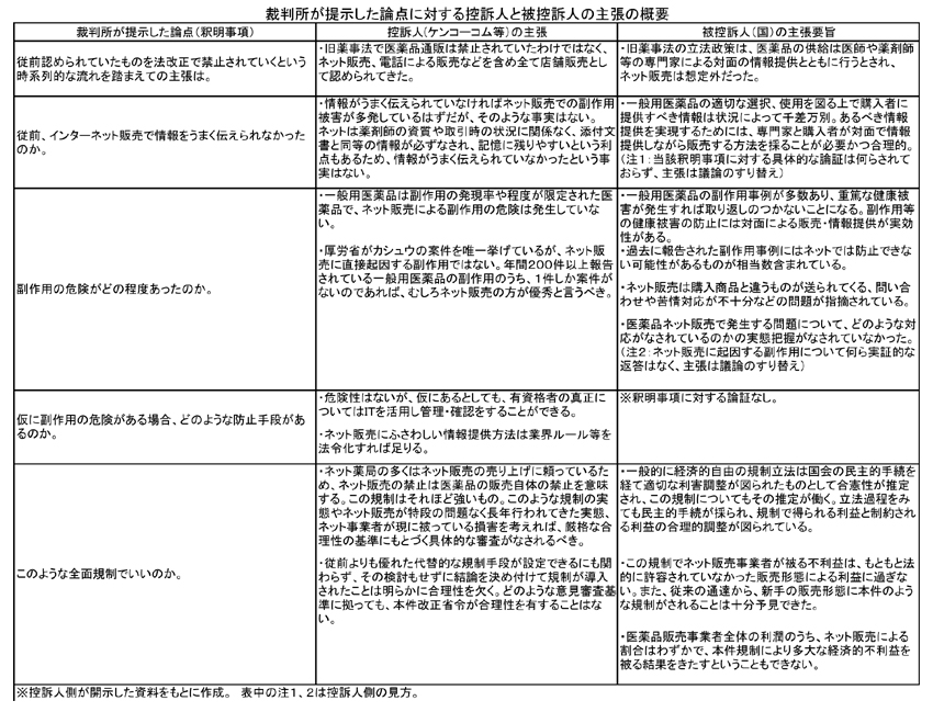 これに基づき高裁側が提示した釈明事項は、(1)従来のネット販売で情報がうまく伝えられなかったのか(2)それにより副作用の危険性がどの程度あったのか(3)仮に副作用の危険性があるとすれば、どのような防止手段があるのか(4)このような全面規制でいいのか、といったもの。控訴人(ケンコーコム等)、被控訴人(国)双方に、釈明事項に基づき主張を整理した回答書の提出を求めていた。