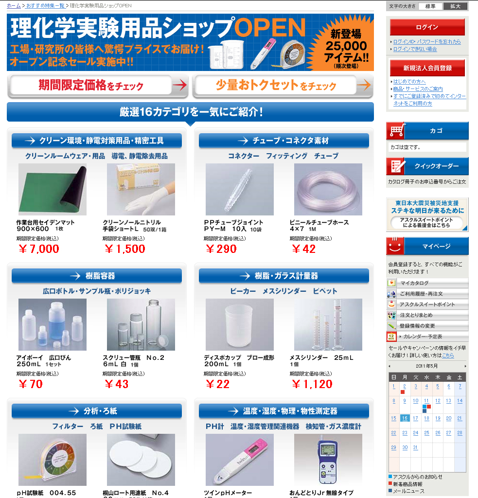 アスクルは5月11日付で通販サイト内に専用コーナー「理化学実験用品ショップ」(画像)を開設。試験管やビーカー、フラスコ、計測器、洗浄機器などの理化学実験用品など約2万5000点のネット販売をスタート。