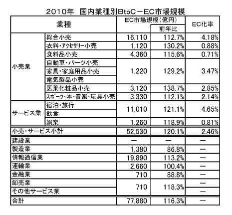 また、BtoB市場は、景況悪化の影響により2009年に大幅な落ち込みを見せたが、昨年はリーマンショック以前の水準にまで回復。業種別では、産業機器・精密機械(前年比42・5%増)、卸売(同36・1%増)、輸送用機械(同34・4%増)が高い伸びを示し、BtoBにおけるEC化率は、15・6%と前年比で1・9ポイント上昇した。