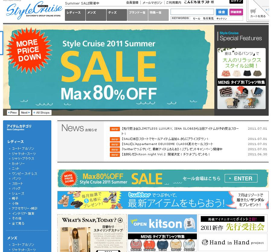 「スタイルクルーズ」は、ベイクルーズブランドをすべて取りそろえるサイトとして展開。アイテム数は7000~8000品番を取り扱っており、顧客層は20~30歳代が80%強を占める。客単価は1万5000円程度と比較的高めだ。