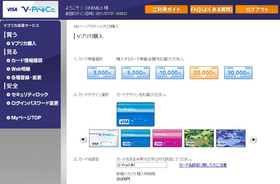 「Vプリカ」の使用にあたっては、まずアカウントを開設後、マイページで3000円・5000円・1万円・2万円・3万円の5種類の中から、希望の金額を購入する。購入には、VisaかMasterCardを使ってネット上で決済を行う。