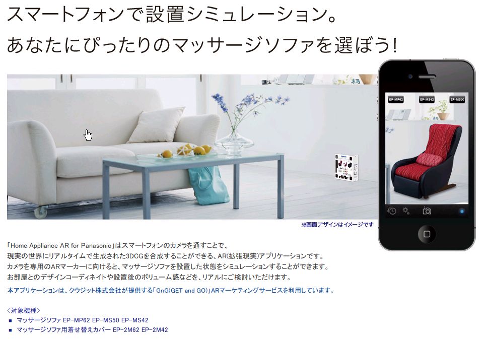 昨年5月にソニーマーケティングが開始した、薄型テレビの設置イメージを確認できる、パソコンやスマートフォン向けサービス「ARレイアウトシミュレーター」にAR技術を提供している。薄型テレビは価格下落が進んでいるものの、高額な買い物であることに変わりはない。実際の設置イメージを確かにしてもらうことで、購入の障壁を下げるとともに、もう1ランク上の商品を買ってもらうきっかけにしたい、という狙いがある。さらに、今年7月にパナソニックが始めた、マッサージチェアの設置シミュレーションを行うスマートフォンアプリにも技術提供をしている。
