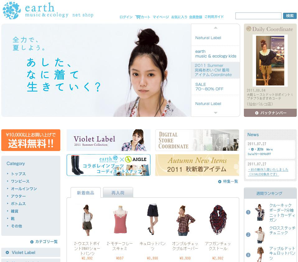 「アースミュージック&エコロジー」の自社通販サイト開設は2009年1月。20代前半の女性をコアターゲットにMDを展開する。その後、10年3月から女優の宮崎あおいさんをブランドのイメージキャラクターに起用し、CM放映を開始した。