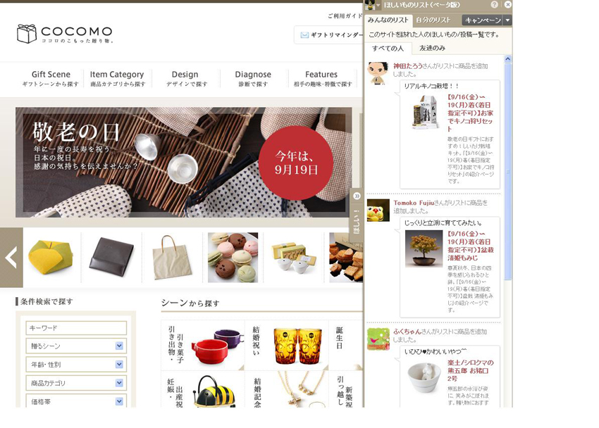 商品への「いいね!」やコメント、「ほしいものリスト」への投稿など、通販サイトにおける基本的な機能をソーシャル化しているのが特徴だ。「ECサイトにタイムライン(TL)があってもいい」(フィードフォース・阿部樹取締役)というコンセプトのもと、画面右に他人のコメントや自分の商品リスト、キャンペーン情報などが分かるTLを表示。どのページからでも他のユーザーの動きが見えるデザインとなっている。投稿は全体やソーシャルメディアの知人、自分のみなど、公開範囲を設定できる仕組み。