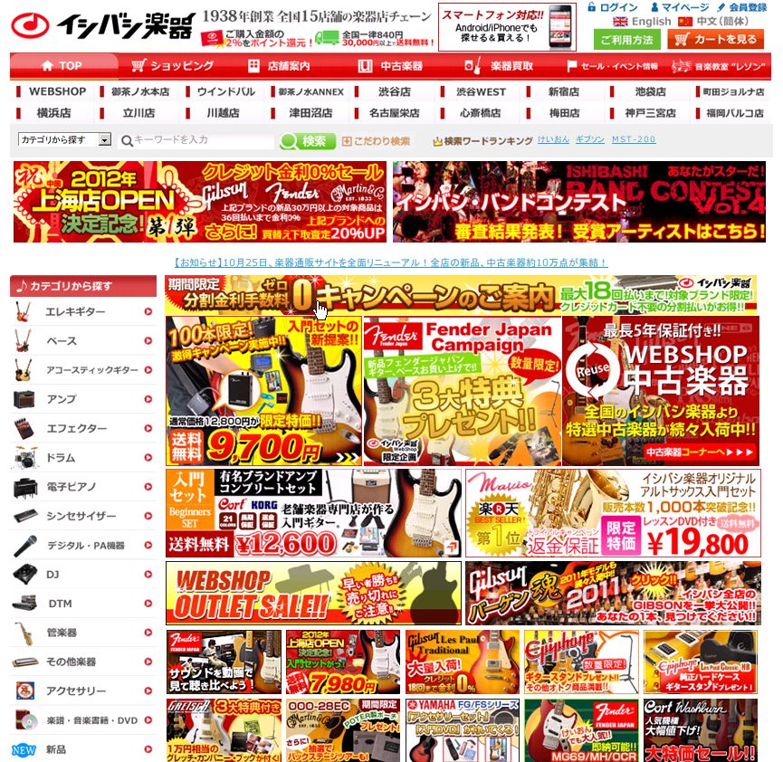 楽器店大手の石橋楽器店のネット販売が好調だ。2011年5月期の売上高は、前期比27・8%増の37億5700万円。全社売上高のほぼ3分の1に達している。11月には通販サイトを刷新した。本店用・中古品用など複数あったショッピングカートを統一し、使い勝手を向上したほか、店舗との在庫連動を実現。スマートフォン専用サイトも開設するなど、さらなる強化を進めている。
