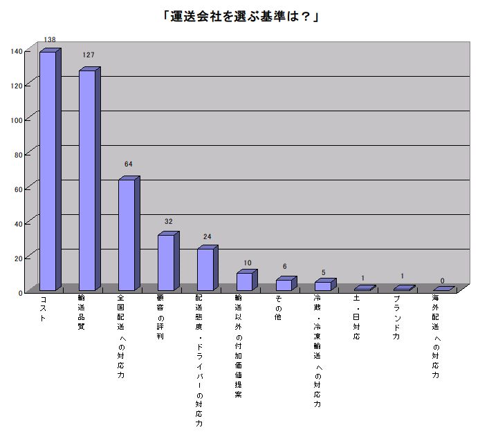 過去1年間に運送会社を変更した企業(5社)にその理由を聞いたところ、「配送品質が悪かったため」(グランマルシェ)と品質重視の傾向がうかがえるケースもあったが、全体としては「総合的に判断した」(マガシーク)や「全体的なサービスの質を考慮した」(ゴールドウイン)などの意見が強かった。(つづく)