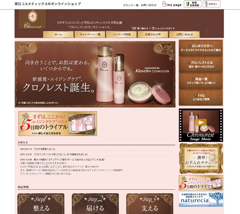 通販サイトでは「クロノレスト」の発売に合わせて、大幅なリニューアルに着手。これまでの単品商品サイトから全ブランドを扱う総合サイトに変更し、商品や肌ケア情報、キャンペーン告知などを発信するスタッフブログも開始した。