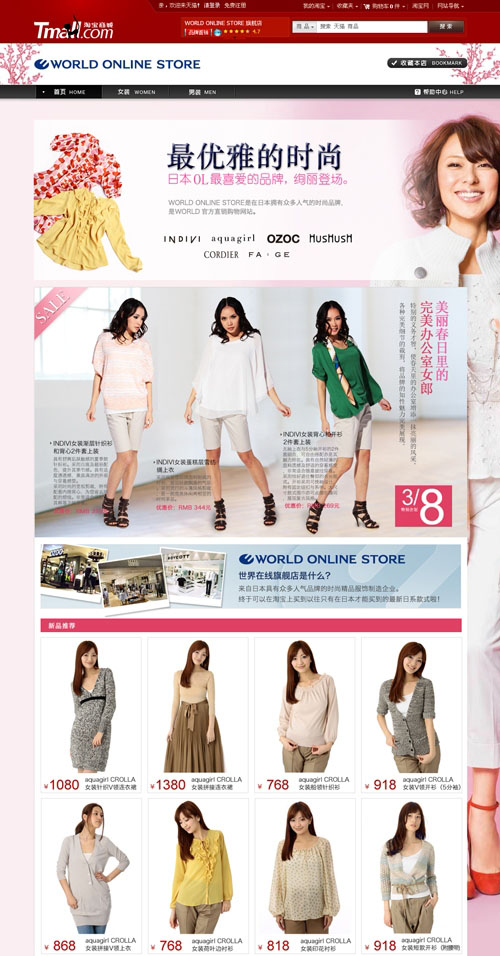 「天猫Tモール」への出店に当たっては、タオバオのサイト上で検索数が多く、中国での認知度が高い「オゾック」などの人気ブランドに加え、同国で実店舗を出店しているOL向けブランド「インディヴィ」「コルディア」「ファージュ」を優先して選定。メンズでは「タケオキクチ」と「ボイコット」を販売する。
