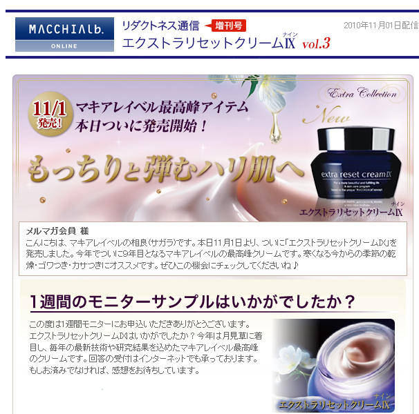 履歴に連動したメールは、同社が年に一度販売する「エクストラリセットクリーム」で特に力を入れた販促を行っている。昨年の購入歴の有無、サンプル配布有無、その年の購買有無でそれぞれ分岐。購入歴がある場合は、値引きなどの優待オファーをつけたメルマガを、ない場合は商品訴求や使用者の声を中心とした内容に、さらにはサンプル購入のある場合は使用方法を説明して本商品購入へ誘導、ない場合はくちコミ紹介、といったように、属性にあわせたメールを配信している。同商品は1万8900円と高額なことから、メールを使った販促に注力しており、十数パターンに細分化してメールを送っているのが特徴だ。