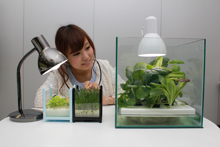 商品は「箱庭栽培」。ケース、LEDライト、液肥、種などがセットになっており、上からLED光を当て、ケースの中で液肥を用いて種から無農薬野菜を育てるというもの。成長までは3~4週間程度。種はベビーリーフやハーブ、レタスなどおよそ50種類で、栽培に必要な光量の関係から、葉モノに特化して販売していく。透明なガラスケースになっているため、観葉植物のような観賞用としての利用も想定している。