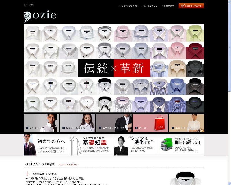 同社は老舗のワイシャツ専業メーカーで、BtoBでの卸売りを長年行っている。自社通販サイト「ozie(オジエ)」(画像)を2002年9月に立ち上げ、本格的にBtoC販売を開始。その後、楽天市場やヤフー、アマゾンなど仮想モールにも出店していった。