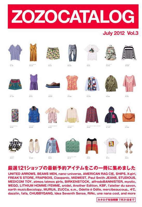 同社が街頭で配布したのは「ゾゾカタログ」の7月号(画像)。同媒体は、定価商品の販売比率改善を目的に、今年5月に創刊した予約商品専用の月刊カタログで、発行部数は各号50万部。