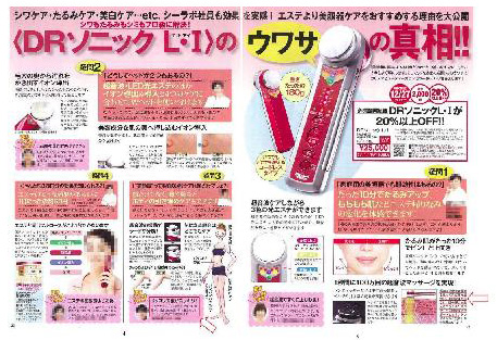 消費者庁によると一昨年12月と昨年の1、6、12月に発行した会報誌で掲載した「DRソニック L・I」の広告で、「微細な振動が角質層を通って真皮層も活性化。新陳代謝が促され、肌の弾力を支えるエラスチンやコラーゲンの産生をサポートします」「微弱な電流を利用して美容成分をイオン化し、電気の流れとともに肌の深部へ送り込みます。通常のお手入れでは浸透しづらい美肌成分も、電気の力でぐんぐん肌へ浸透します」などと記載(画像は同社の会報誌=消費者庁の資料より)。「細胞の活性化や脂肪分解、殺菌、肌の汚れの除去、肌への美容成分の浸透などの効果が得られると認識させる表示をしていた」(消費者庁表示対策課)という。