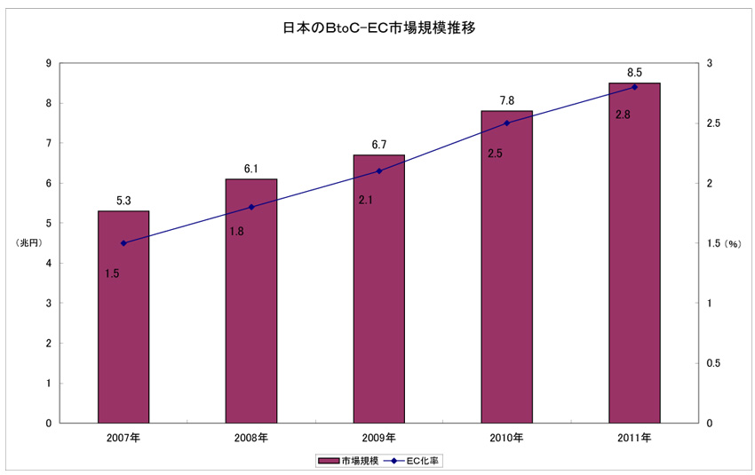 経産省EC市場調査、ネット販売市場規模、2011年度国内BtoC8.5兆円に