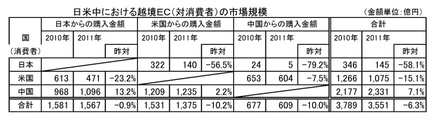 一方、前回から行っている日米中3カ国間における越境ECの調査についてみると、各国消費者の越境EC利用状況は、日本消費者の米国および中国事業者からの購入額が同58・1%減の145億円、米国消費者の日本および中国事業者からの購入金額が同15・1%減の1075億円、中国消費者の日本および米国事業者からの購入金額は同7・1%増の2331億円だった。