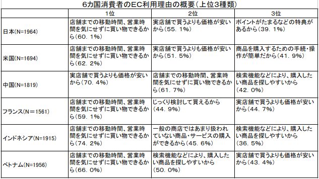 このほかに比較的多かったEC利用理由は、「一般の商店ではあまり扱われていない商品・サービスが購入できるから」「検索機能などにより購入したい商品を探しやすいから」、同一商品や類似商品の「価格が比較できるから」など。各国の消費者は、実店舗にはない商品・サービス、機能にECの魅力を感じているようだ。