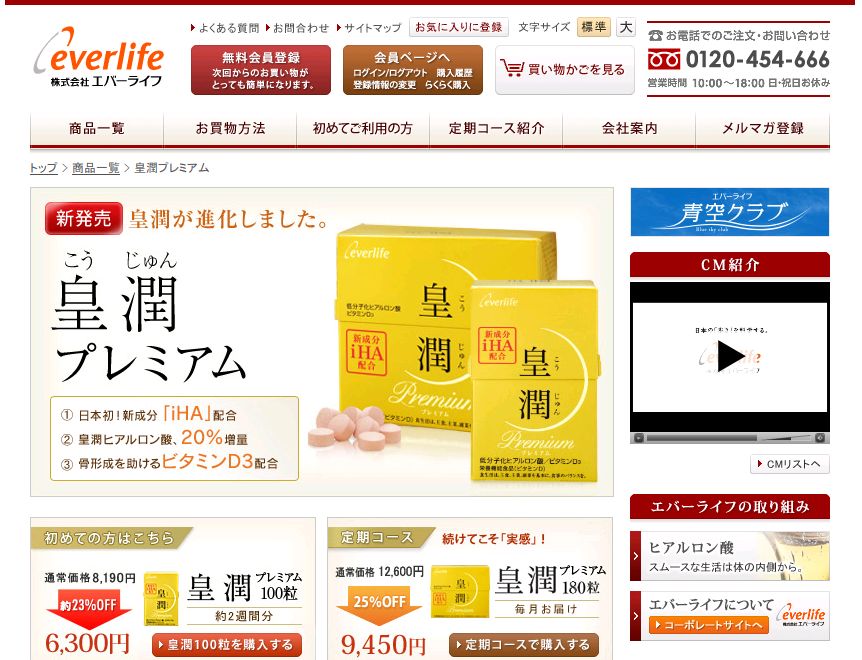 エバーライフでは、テレビCMやウェブ、紙媒体を通じた情報発信をで「〓HA」の啓発を推進。エビデンスの充実を図り、企業の信頼感醸成にも努め、従来の「皇潤」の顧客の主要年齢層より若い50~60代前半の顧客獲得を進める。ォマーシャルの集中投下で「皇潤(ヒアルロン酸)=関節対応」とのイメージ浸透を図り、2010年3月期には「皇潤」シリーズを中心に売上高は約263億円に達した。
