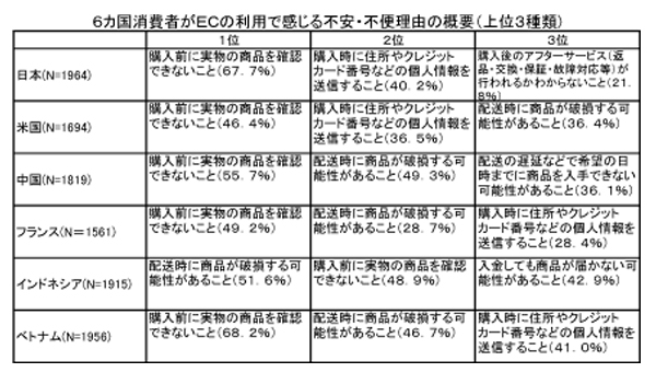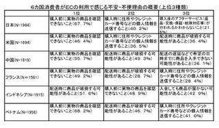 このほかに6カ国でほぼ共通してみられたのは、商品購入時におけるカード番号などの個人情報の送信への不安。日本消費者については、商品の返品や交換、問い合わせやトラブル対応など、商品購入後のEC事業者のカスタマーサポート体制を不安理由に挙げる傾向が見られた。(おわり)