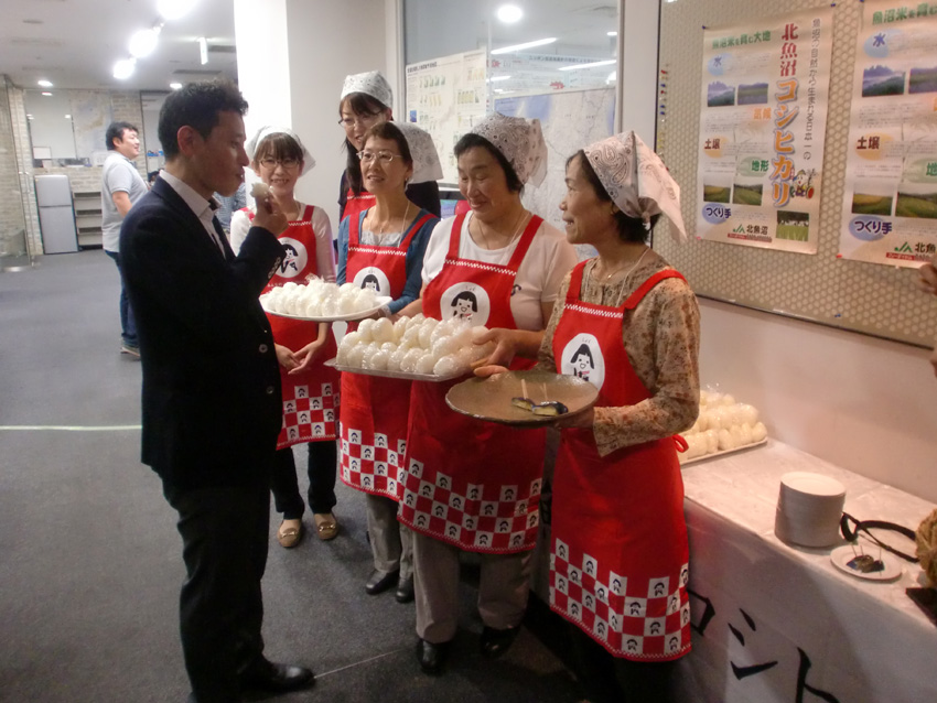 なお、ラジオCMの放送を開始した9月27日には「魚沼産こしひかり」を作っているJA北魚沼の生産者が都内のニッポン放送の本社を訪れ、実際にこしひかりを使ったおにぎりを作って、ニッポン放送の社員に振舞う試食会(=写真)を実施した。メディア関係者やラジオパーソナリティなども頻繁に行き来する場所で試食会を行ない、PRすることで、くちコミ効果を狙いたい考えもあったようだ。
