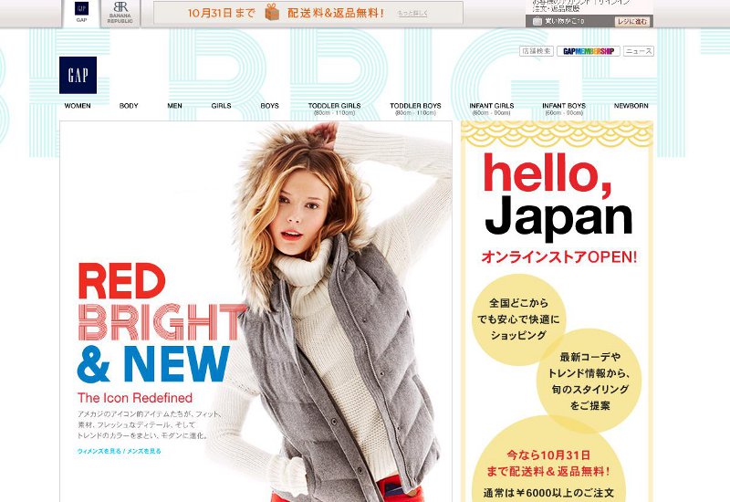 カジュアル衣料大手のギャップジャパンは10月10日、米国本社が運営するオンラインストアの日本版サイト「Gapオンラインストア」と「バナナ・リパブリック オンラインストア」を同時にオープンした。すでに日本での知名度も高く、また、レディースやメンズ、キッズ・ベビーまで幅広い商品ラインアップを持つGapブランド。日本では珍しい返品商品の店頭受け取りサービスなどを武器に、ネット販売市場を開拓する。