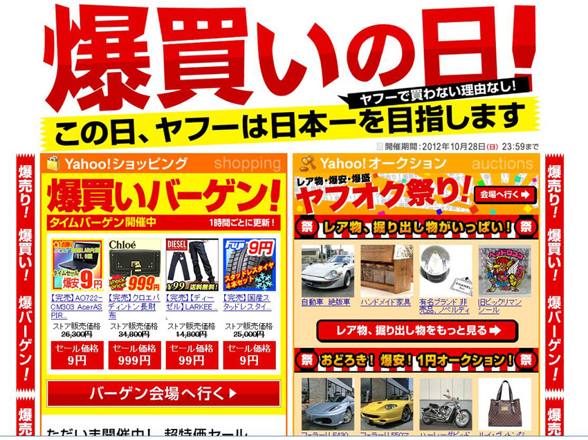 この日は「ヤフー・オークション」でも「ヤフオク祭り!」と題して、希少価値の高い商品を1円から紹介する「1円スタートオークション」や大量の食品を山分け入札する「爆盛オークション」などを開催。オークション利用の底上げを図った。