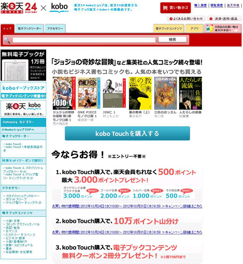 なお、「コボイーブックストア」の日本語コンテンツ数が3万冊に到達したのは8月24日。現在はインターネット百科事典「ウィキペディア」の作家情報などを含め、約6万5千冊になっている。