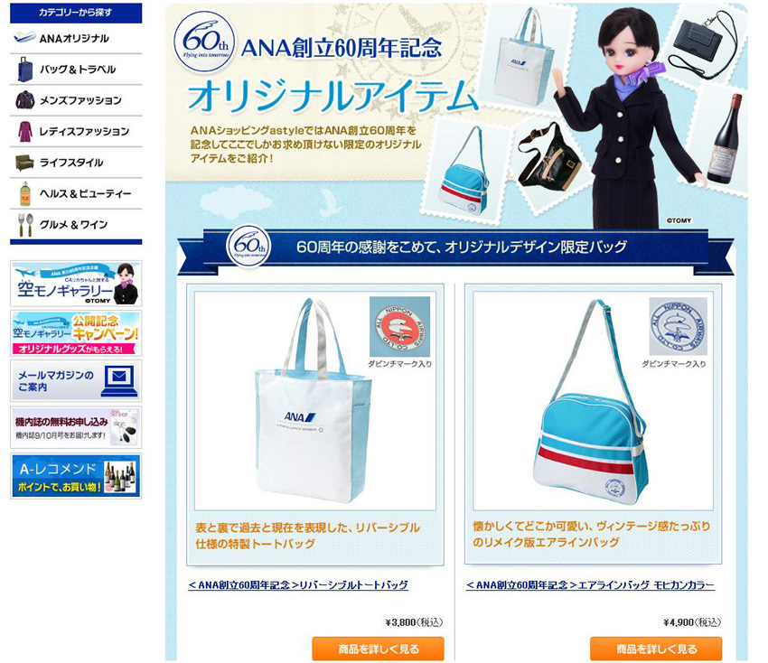 全日空商事は通販サイトでANAの創立60周年を記念したキャンペーンを展開している。10月17日から、通販サイト内に特別コンテンツを開設して復刻商品や新商品などの60周年記念商品を販売。また、人気キャラクターの「CAリカちゃん」をパーソナリティに起用し、フェイスブックページなどで企画を紹介していくほか、目玉商品としてCAリカちゃんのフィギュアも発売する。新たな客層へアプローチし、同企画で1億円の売り上げを狙う。