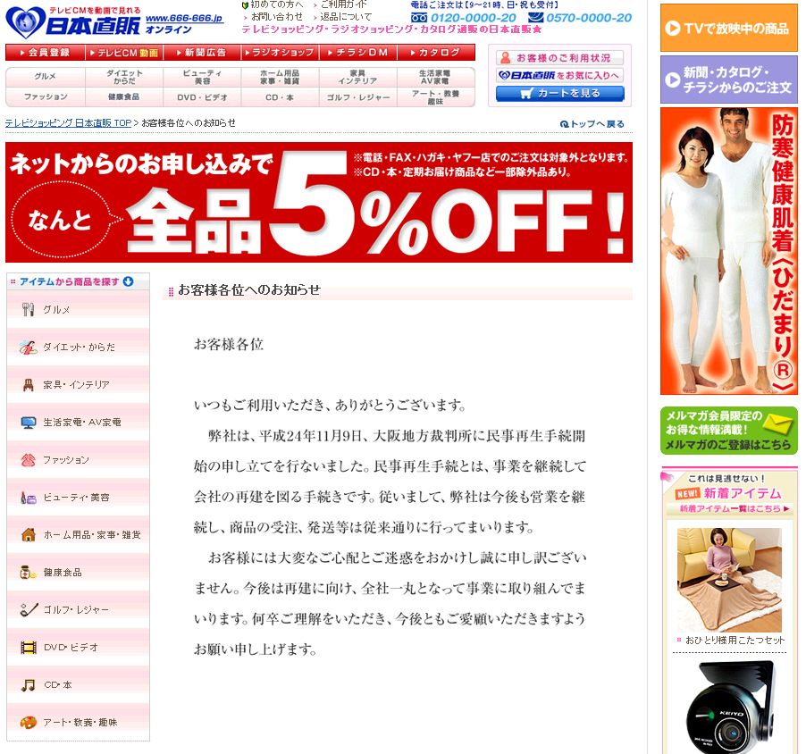 「日本直販」というテレビ通販の草分け的な存在。粉飾決算の疑惑。174億円という巨額の負債。同社の破たんは世間からも注目を浴び、一般紙や週刊誌などで様々に報道された。