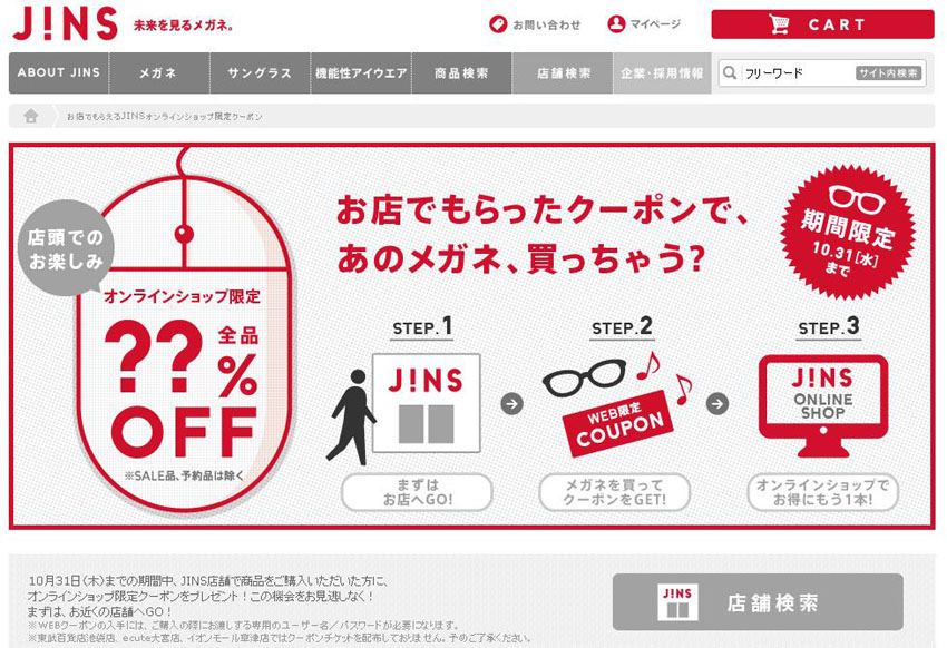 ジンズは9月14日~10月31日の期間、実店舗で度付き眼鏡を購入した顧客を対象に、自社通販サイト「ジンズオンラインショップ」限定で使えるクーポンを配布するキャンペーンを実施した。