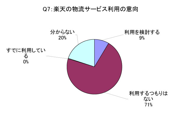 問7で、楽天が拡充を予定している物流サービスの利用を考えているか聞いたところ、「利用を検討する」と回答した店舗は9%にとどまり、「利用するつもりはない」が大半(71%)を占める結果となった。