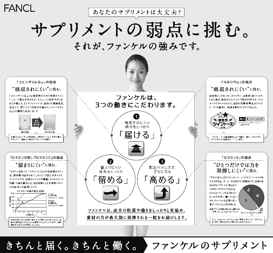 顧客との関係性構築では「きちんと届く。きちんと働く。」というコミュニケーションワードを定め、事業全体に共通するメッセージとして訴求することで、コンセプトの理解促進を図る。開発コンセプトを分かりやすく伝える表現として、(1)吸収されにくい成分をしっかり「届ける」、(2)留まりにくい成分をじっくり「留める」、(3)成分の配合バランスで力を「高める」を用い、配合量ではなく、機能の"働き"にこだわった製品であることを伝える。すでに2月中旬から全国で、「体内効率」というコンセプトを伝える新聞の全段広告(=画像は全段広告の上部10段分)も展開している。