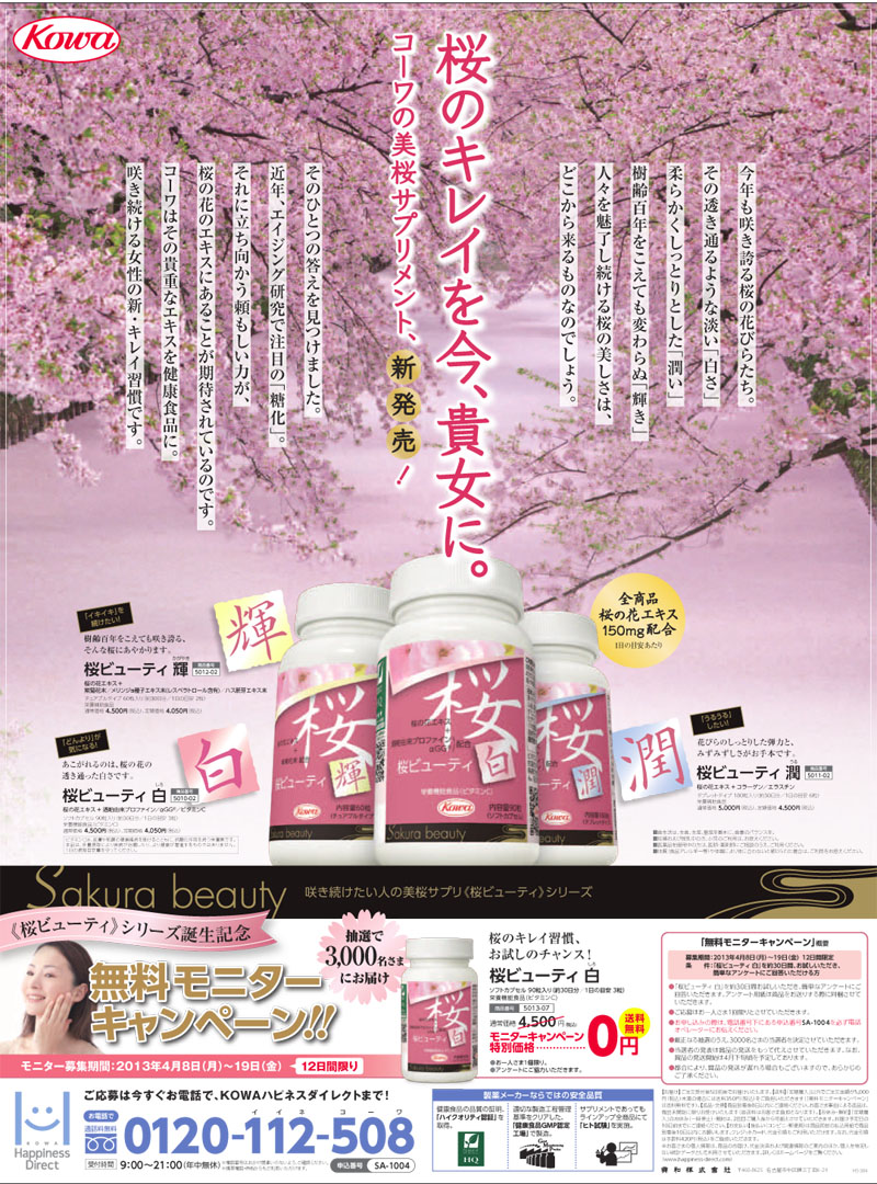 興和が健康食品通販を本格化する。4月から、桜の花エキスを共通成分として配合したオリジナル処方の製品をラインアップ。出稿量は明らかにしていないものの、広告の大量投下で新シリーズの認知向上を図っていく。桜の花エキスは、複数の通販事業者が扱うもののいまだ未成熟の市場。広告の集中投下で新市場を創出し、シェアを獲得していく。