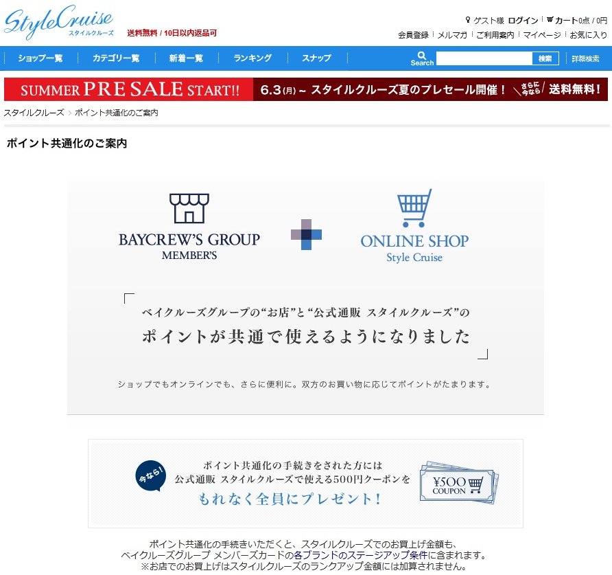 同社の場合、店頭で使えるメンバーズカードの会員と通販サイトで登録する会員とで2つのデータベースが存在する。店頭とネットで1つの会員制度にすれば効率的なのだが、そもそものスタート段階で2つに分かれていた。そこで昨年8月から、ユーザーに共通化の手続きを行ってもらい、2つ存在しているIDを1つに紐付ける取り組みを実施。このポイント共通化では「スタイルクルーズ」で利用できる500円分のクーポンを付与し、手続きの促進を図っている(=画像)。