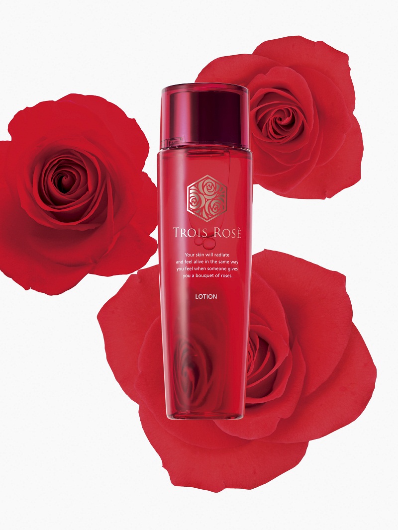 バラ(ローゼ)エキスは抗酸化、抗糖化、抗光老化の3つ(トゥロア)の作用が期待されることから「トゥロアローゼ」と名付け、エイジングケアを前面に打ち出す。
