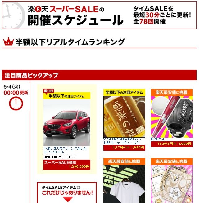 楽天(本社・東京都品川区、三木谷浩史社長)が仮想モール「楽天市場」で実施している「楽天スーパーSALE」では、毎回多数の「半額以下アイテム」を販売する。中でも目玉となるのが、「注目商品ピックアップ」として、セール開催前から告知している、お買い得商品だ。