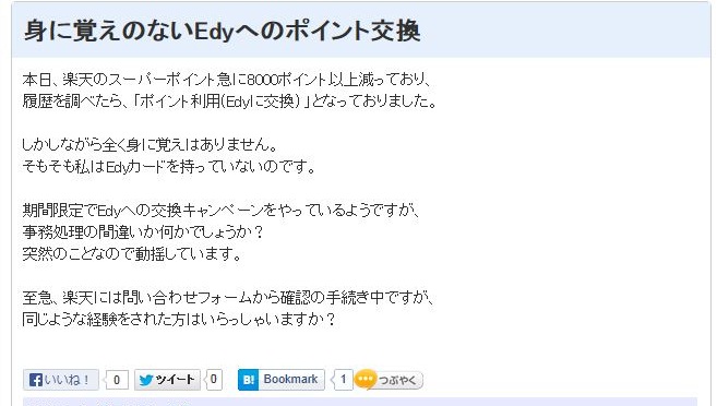 6月頃から、フェイスブックやツイッターなどで「楽天ポイントが知らない間にEdyに交換されていた」「楽天ポイントを全部Edyに換えられていた」など、被害を訴える楽天市場会員の書き込みがみられた。楽天では、7月10日に「他社サイトから流出したID・パスワードを使った不正ログインの発生およびパスワード変更のお願いについて」という告知文を公表した。