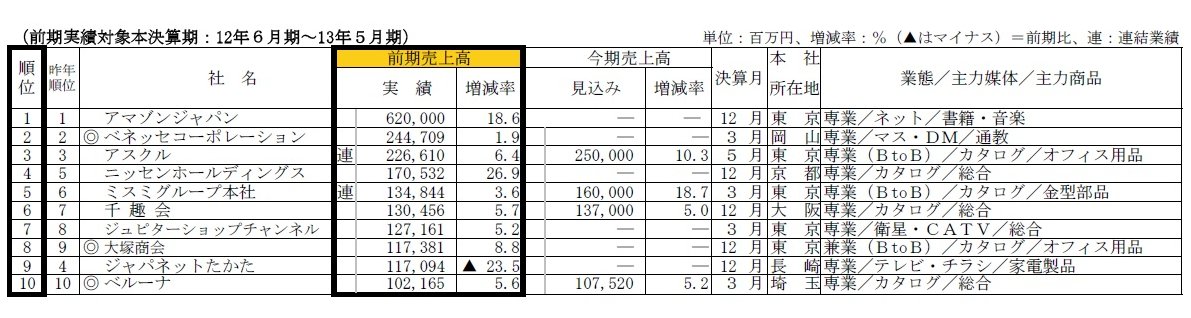 (※表は週刊通販新聞本紙で掲載した1~300位までの売上高ランキングの中から上位10位のみを掲載。11位~300 位および、利益率・増収率ランキング、健康食品・化粧品・食品・衣料品など商材別ランキングは本紙のみに掲載しております。 「通販新聞」の購読はこちらをご覧下さい)
