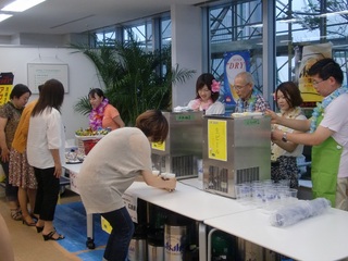 会場の一角に設置したビアサーバーには午後5時半のビアガーデンのスタート直後から行列ができるほど盛況。また、石川社長や上田会長をはじめとする経営幹部8人のカンパと同社食品部が協力した駄菓子や枝豆、缶詰やビーフジャーキーなどのおつまみも好評だったようだ。なお、生ビールは簡単なおつまみ付きで1杯200円で販売。先のビーフジャーキーや缶詰などの「高級おつまみ」は100円または300円と別途、寄付を募る。ビールの売上金はビールサーバーのレンタル代など諸経費を引いた分の全額を、前回と同様、ソーラー発電の設置や普及を推進するNPO法人「そらべあ基金」に寄付する。
