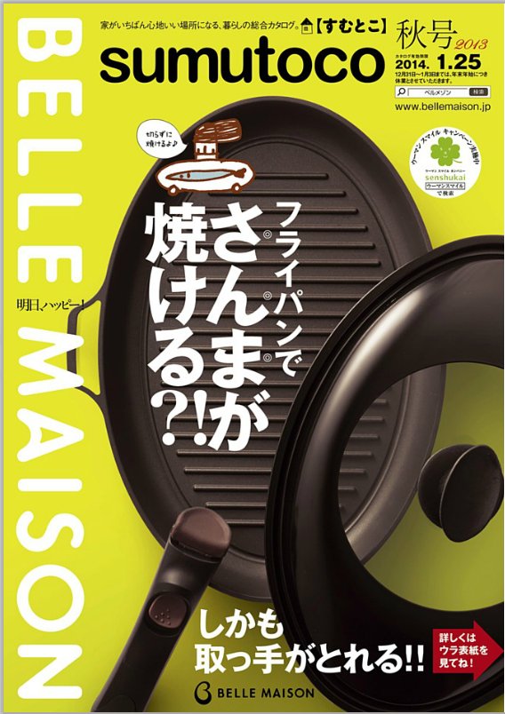 「すむとこ」秋号の表紙を使って展開しているのは、楕円形の魚焼きフライパン。掃除が面倒なグリルを使用せずに魚が焼けるほか、収納スペースが有効に使える形状であることなどが支持され、同社のオリジナル商品の中でも売れ筋になっている。さらに今回は、より便利に使えるよう取っ手が脱着できるリニューアル商品を投入。同社でも、重点商品と位置付けて展開するものだ。