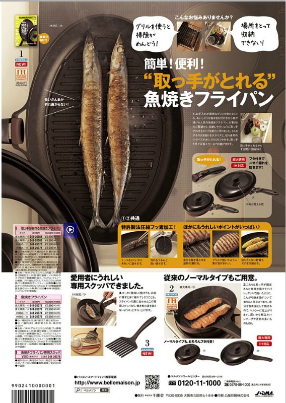 裏表紙では、リニューアル商品の「取っ手がとれる魚焼きフライパン」(税込価格3990円、4990円)と既存商品の「魚焼きフライパン」(同2990円、3990円)のほか、付属の新商品となる焼いた魚の身を崩さずにすくい上げて皿に盛りつけられる「魚焼きフライパン専用スクッパ」(同990円)を掲載。実際に魚を焼いている画像や機能説明の画像を使い、商品の使用イメージの喚起を図っている。