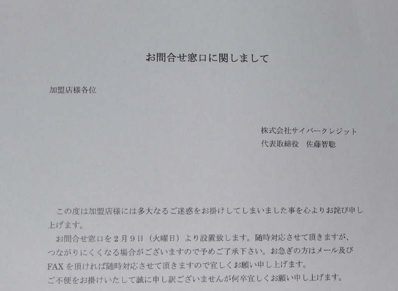「サイバークレジットが飛んだらしい」。簡易ブログ「ツイッター」でこうした情報が飛び交ったのは2月2日の昼ごろ。すでにサイバー社の代表電話は通じず、あわてた取引先が多数押し寄せた事務所にも「臨時休業のお知らせ」という張り紙が残されているだけだった。