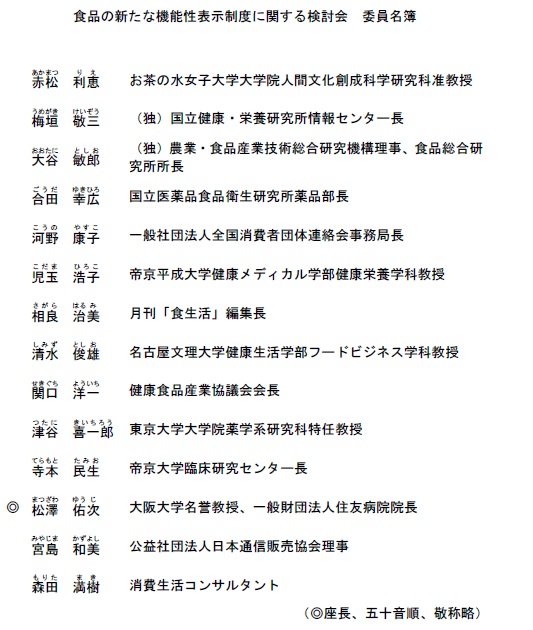 検討会委員は14人。消費者庁では「専門的見地からさまざまな角度で意見がうかがえるよう最大限配慮した」と、人選の理由を説明。座長には、大阪大学名誉教授で住友病院院長の松澤佑次氏を選出。農作物や健食の機能性評価に関わる学術分野の委員を多く配置した。