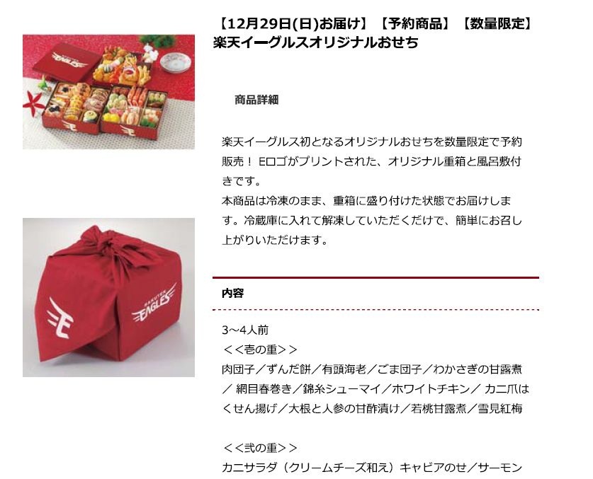 楽天市場内で販売されるおせち料理も、ルールに従って原料原産地表示や原材料表示などがされている(画像上)。ところが、同モールに出店する「楽天イーグルスオンラインショップ」で11月に予約販売された「楽天イーグルスオリジナルおせち」では、おせちの内容説明はあるものの、原料原産地表示や原材料表示などは販売ページ内にはなく、こうした内容が記載されたページが販売ページからリンクされていることもなかった(画像下)。