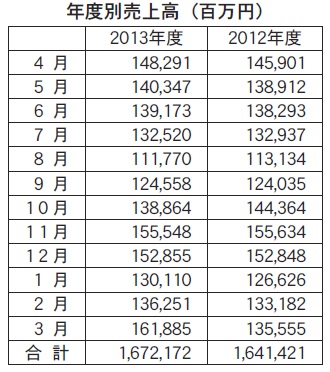 日本通信販売協会の売上高月次調査集計によると、対象約150社の2013年度(13年4月~14年3月)の総売上高は前年度比1・9%増の1兆6721億7200万円だった(表参照)。「衣料品」や「食料品」全体、「通信教育・サービス」などの項目がマイナスとなったものの、「雑貨」全体や「文具・事務用品」「家庭用品」などが好調に推移し、全体ではプラスとなった。