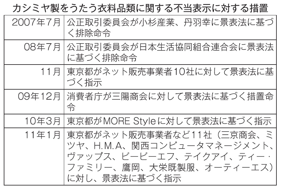 「カシミヤ」の表示を巡っては、これまで多くの事業者が処分されているが、不当表示がなくなっていない。07年以降、把握できているだけで、処分は6事案26社(東京都の指示、公正取引委員会の排除命令を含む)。消費者庁は、仕入れ事業者に検査証明書の提出を求めることが望ましいとしているが、過去には、事業者が虚偽の検査証明書を信じたとして不当表示に至った例もある。