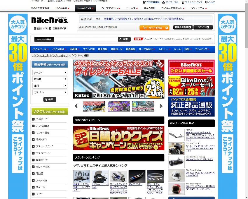 軸となっているのは自社通販サイトの「バイクブロス」(画像)と、親会社であるプロトコーポレーションから運営を譲り受けた「グーバイクパーツ」の2サイト。会員登録が不要の「グーバイクパーツ」は主に一見顧客の窓口となっており、対して「バイクブロス」は会員登録を必須とし、その分商品を割安で提供していることからリピート顧客に向けての窓口になっている。