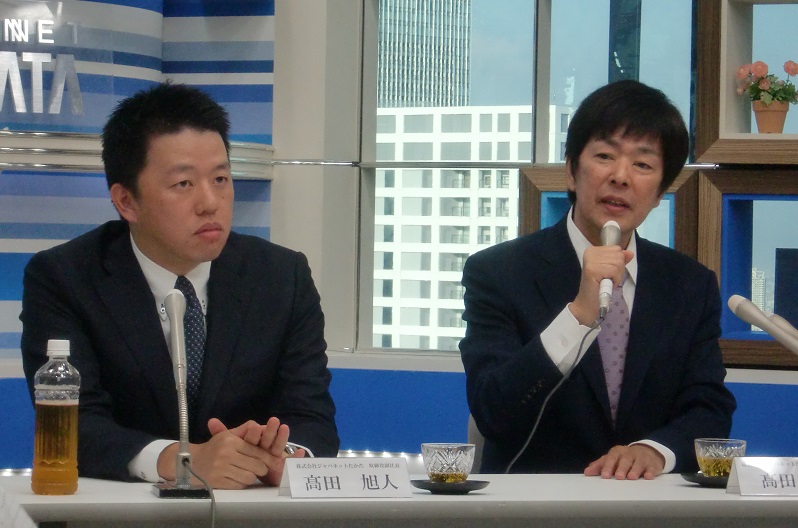 ジャパネットたかたは7月31日、取引先などを招き都内で開催した「テレビショッピング20周年記念感謝の会」で同社の創業者で社長の髙田明氏が来年1月16日付けで社長を退任し、長男で副社長の髙田旭人氏が新社長に昇格すると正式に発表した。髙田社長は過去最高益の更新を目指した前期(2013年12月)の業績が目標通りに達成でき、副社長をはじめとする社員の力を実感できたことなどを挙げ、社長を退くことを決めたという。会合後に開いた記者会見で髙田明社長と髙田旭人副社長が社長交代の理由や今後の同社の方向性などについて語った。(本紙記者を含む報道陣との一問一答の中から一部を要約および抜粋して掲載)