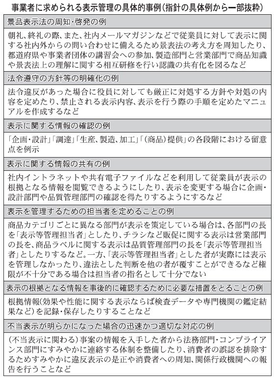 指針は、景表法改正のきっかけともなった食品の表示偽装問題を念頭に策定されている。ただ、その取り組みは食品に限ったものではない。事業者が行うべき取り組みを「景品表示法の周知・啓発」「法令遵守の方針の明確化」「表示に関する情報の確認」「表示に関する情報の共有」「表示を管理するための担当者等を定めること」「表示の根拠となる情報を事後的に確認するために必要な措置をとること」「不当な表示が明らかになった場合における迅速かつ適切な対応」の7項目に分類。具体的な事例も示した。