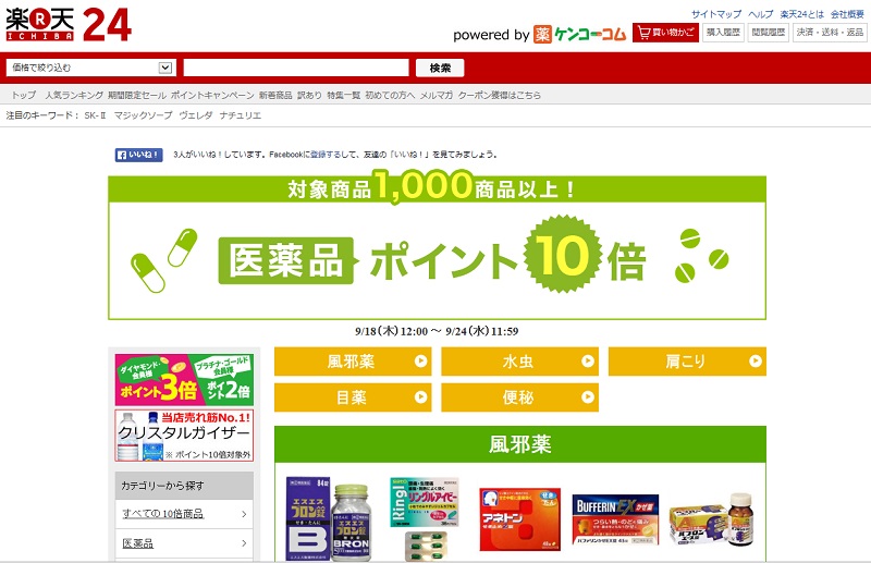 ケンコーコムは9月18日、売れ筋商品に特化したEDLP(エブリデイロープライス)の日用品通販サイト「楽天24」で一般用医薬品の取り扱いを始めた。下期に入り進めている同サイトの拡販策の一環となるもので、第2類および第3類医薬品約4200品目を展開。品ぞろえの拡充による買回りの利便性向上で、売り上げの拡大につなげる構えだ。