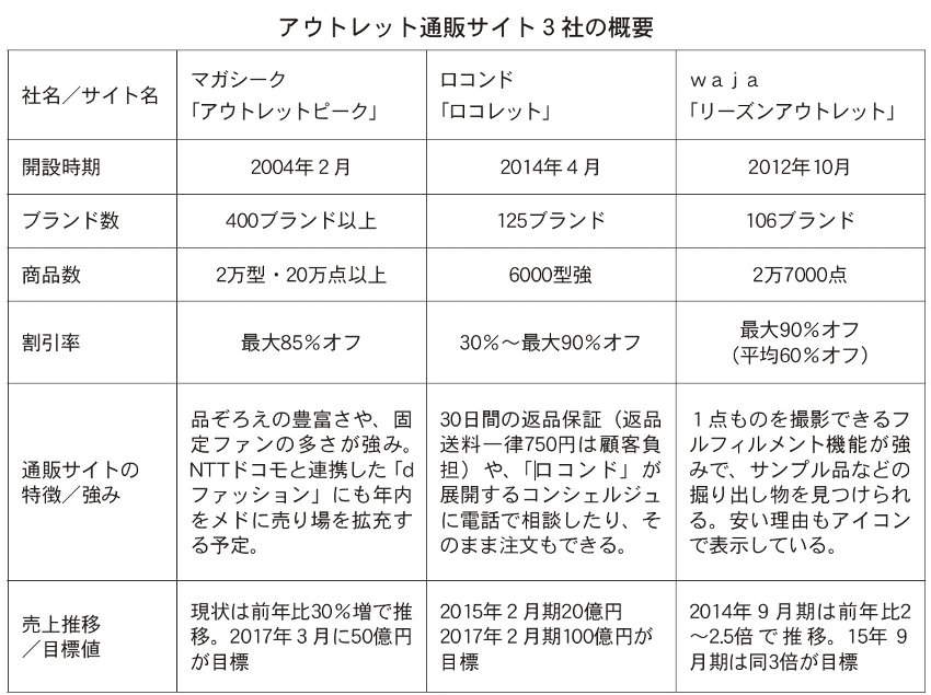 ファッション商材のアウトレットEC市場が盛り上がっている。リアルの売り場ではアウトレットモールが飽和状態とも言われる中、ネット上の売り場に対しては、ブランド側も単なる在庫の処分だけではなく、実店舗ではリーチできない顧客の獲得なども期待しているようだ。最近では、ブランドが運営する自社通販サイト内にアウトレット品を扱うコーナーを開設する動きも出てきているが、品ぞろえの豊富さや会員数も含め、アウトレット品を扱う通販モールの成長率は高そうだ。今号では、特徴のある通販モールを運営する3社をとり上げ、各サイトの強みや成長戦略などを見ていく。